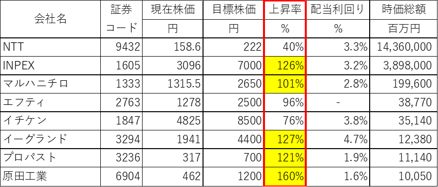 2026年に株価の上昇が期待できるおすすめ銘柄は以下の表の通りの8社です。